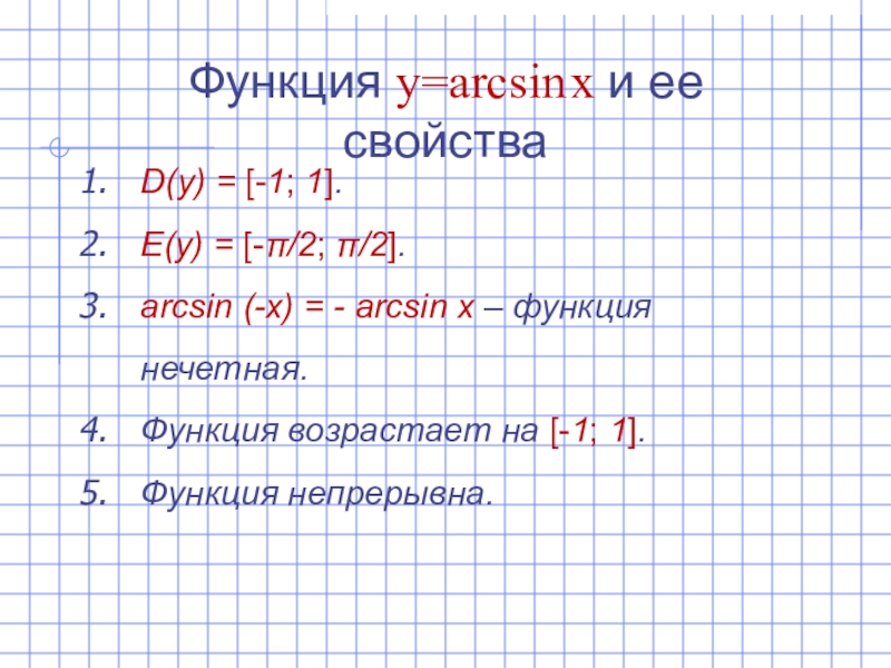 Функция y=arcsin x и ее свойстваD(y) = [-1; 1].E(y) = [-π/2; π/2].arcsin (-x) = - arcsin x