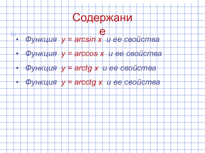 СодержаниеФункция y = arcsin x и ее свойстваФункция y = arccos x и ее свойстваФункция y = arctg x и ее свойстваФункция y = arcctg x и ее свойства