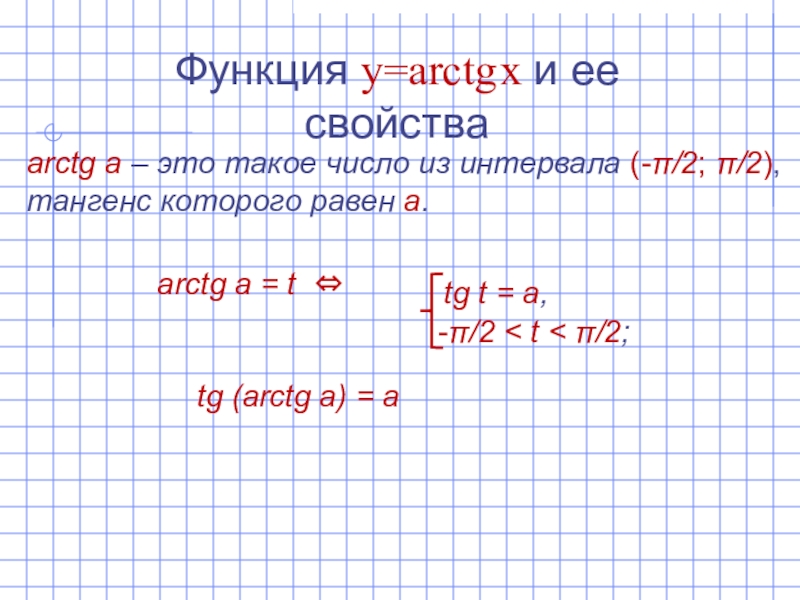 Функция y=arctg x и ее свойстваarctg а – это такое число из интервала (-π/2; π/2), тангенс которого
