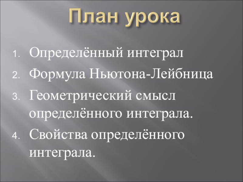 Определённый интегралФормула Ньютона-ЛейбницаГеометрический смысл определённого интеграла.Свойства определённого интеграла.