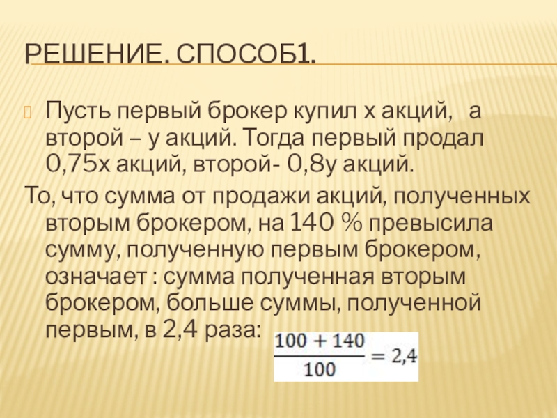 То, что сумма от продажи акций, полученных вторым брокером, на 140 % превысила сумму, полученную первым брокером, означает : сумма полученная вторым брокером, больше суммы, полученной первым, в 2,4 раза: