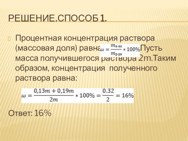 . Пусть масса получившегося раствора 2m.Таким образом, концентрация полученного раствора равна: