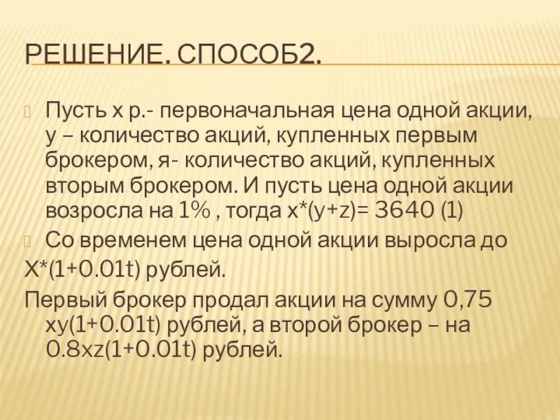 акций, купленных первым брокером, я- количество акций, купленных вторым брокером. И пусть цена одной акции возросла на 1% , тогда х*(y+z)= 3640 (1)