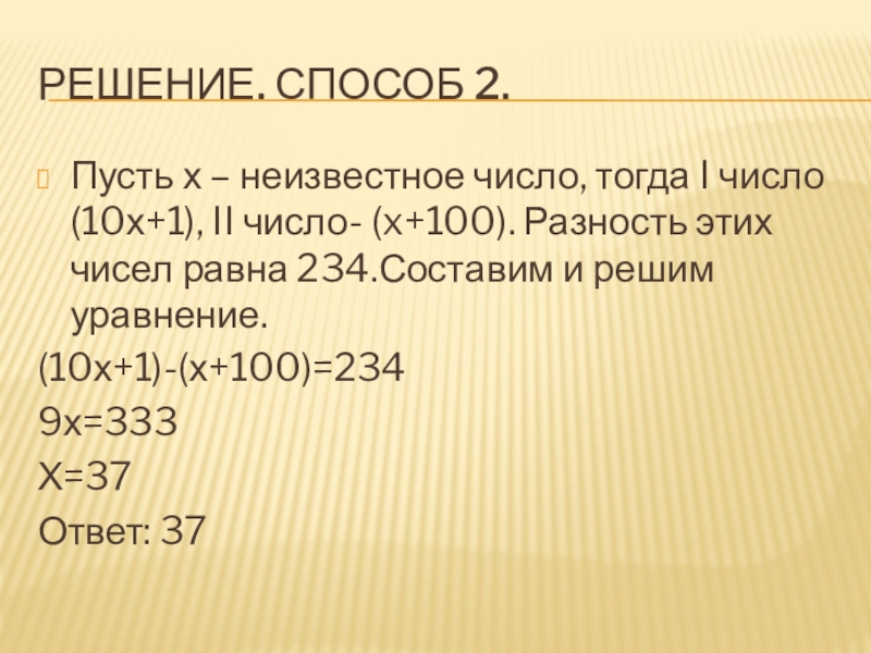 II число- (x+100). Разность этих чисел равна 234.Составим и решим уравнение.
