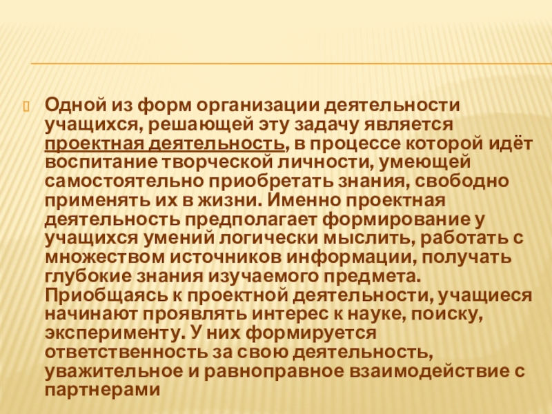 деятельность, в процессе которой идёт воспитание творческой личности, умеющей самостоятельно приобретать знания, свободно применять их в жизни. Именно проектная деятельность предполагает формирование у учащихся умений логически мыслить, работать с множеством источников информации, получать глубокие знания изучаемого предмета. Приобщаясь к проектной деятельности, учащиеся начинают проявлять интерес к науке, поиску, эксперименту. У них формируется ответственность за свою деятельность, уважительное и равноправное взаимодействие с партнерами