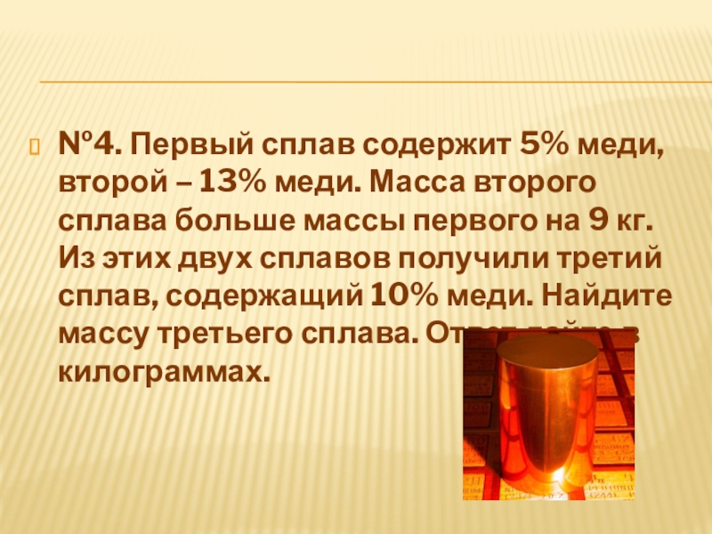 Слайд 25№4. Первый сплав содержит 5% меди, второй – 13% меди. Масса