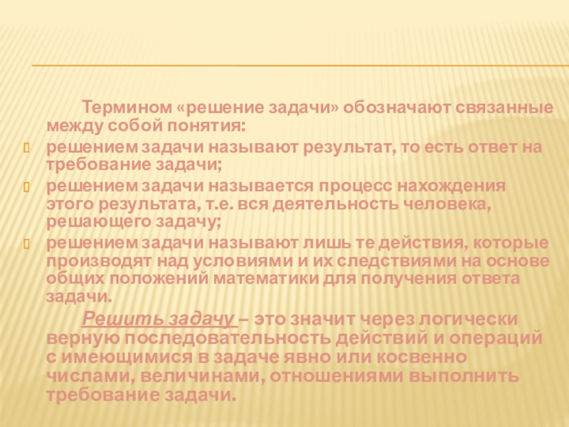 решением задачи называют лишь те действия, которые производят над условиями и их следствиями на основе общих положений математики для получения ответа задачи.