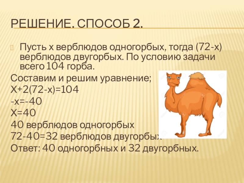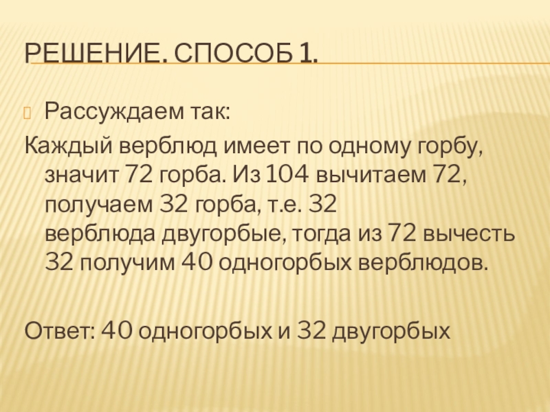горба. Из 104 вычитаем 72, получаем 32 горба, т.е. 32 верблюда двугорбые, тогда из 72 вычесть 32 получим 40 одногорбых верблюдов.