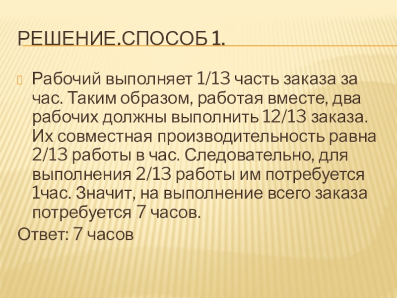 вместе, два рабочих должны выполнить 12/13 заказа. Их совместная производительность равна 2/13 работы в час. Следовательно, для выполнения 2/13 работы им потребуется 1час. Значит, на выполнение всего заказа потребуется 7 часов.