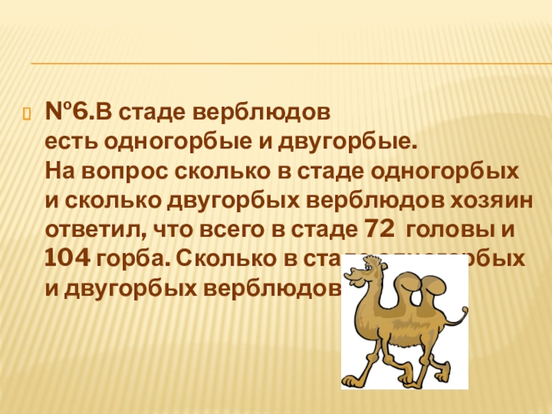 Слайд 31№6.В стаде верблюдов есть одногорбые и двугорбые. На вопрос сколько в стаде одногорбых и сколько