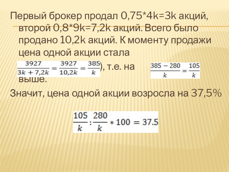 Слайд 37Первый брокер продал 0,75*4k=3k акций, второй 0,8*9k=7,2k акций. Всего было продано