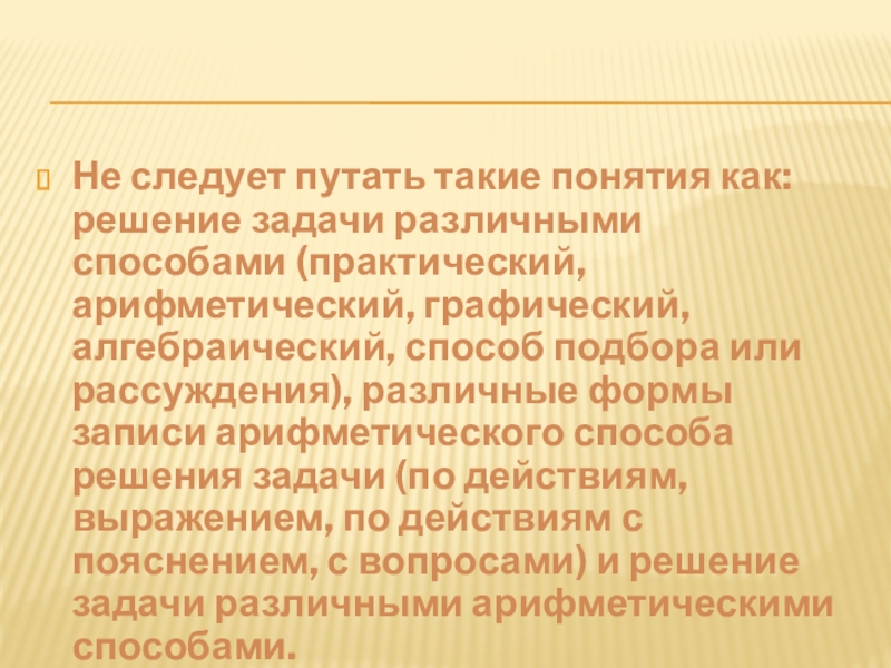 Слайд 12Не следует путать такие понятия как: решение задачи различными способами (практический,