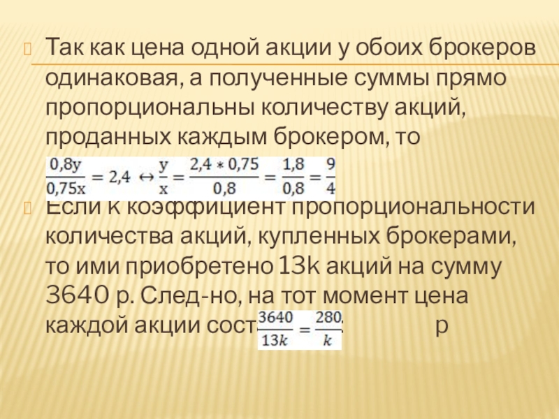 Слайд 36Так как цена одной акции у обоих брокеров одинаковая, а полученные