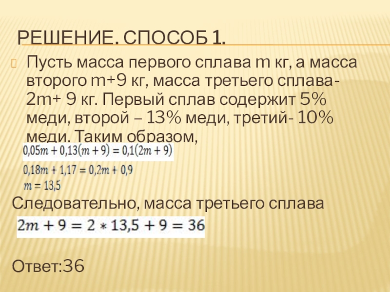m+9 кг, масса третьего сплава- 2m+ 9 кг. Первый сплав содержит 5% меди, второй – 13% меди, третий- 10% меди. Таким образом,