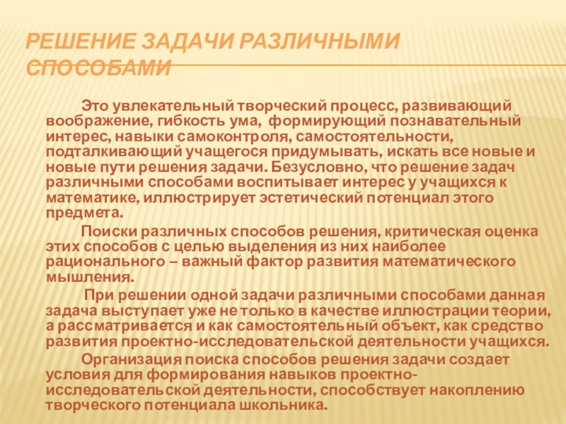 При решении одной задачи различными способами данная задача выступает уже не только в качестве иллюстрации теории, а рассматривается и как самостоятельный объект, как средство развития проектно-исследовательской деятельности учащихся.