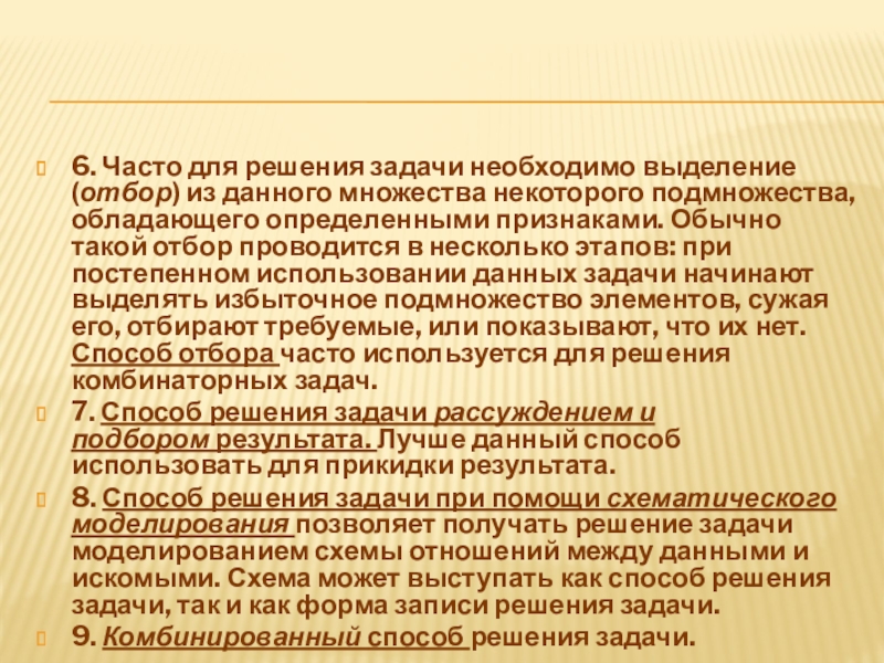 некоторого подмножества, обладающего определенными признаками. Обычно такой отбор проводится в несколько этапов: при постепенном использовании данных задачи начинают выделять избыточное подмножество элементов, сужая его, отбирают требуемые, или показывают, что их нет. Способ отбора часто используется для решения комбинаторных задач.