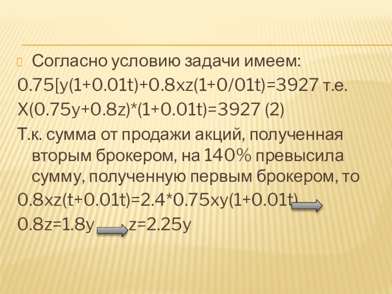 Первый брокер продал акции на сумму 0,75хy(1+0.01t) рублей, а второй брокер – на 0.8xz(1+0.01t) рублей.