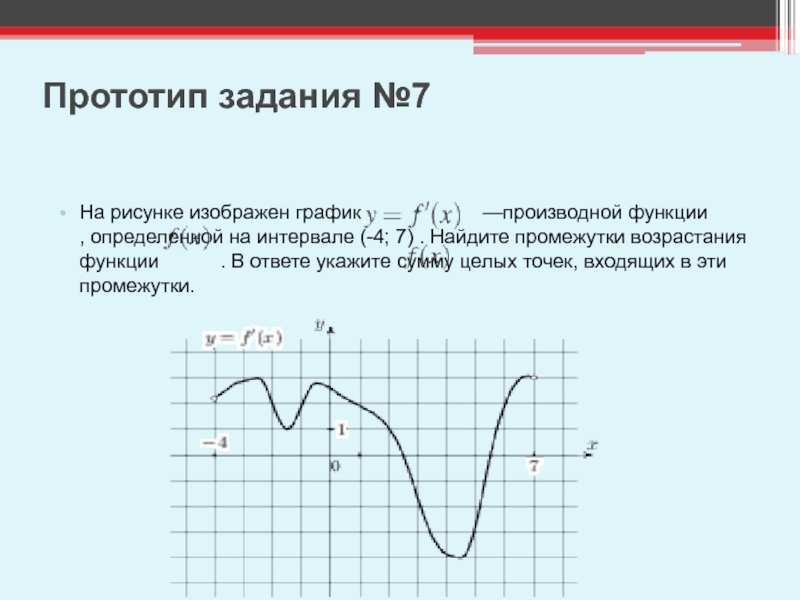 —производной функции , определенной на интервале (-4; 7) . Найдите промежутки возрастания функции . В ответе укажите сумму целых точек, входящих в эти промежутки.