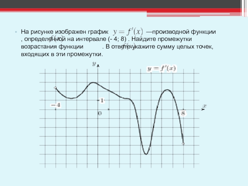 —производной функции , определенной на интервале (- 4; 8) . Найдите промежутки возрастания функции . В ответе укажите сумму целых точек, входящих в эти промежутки.