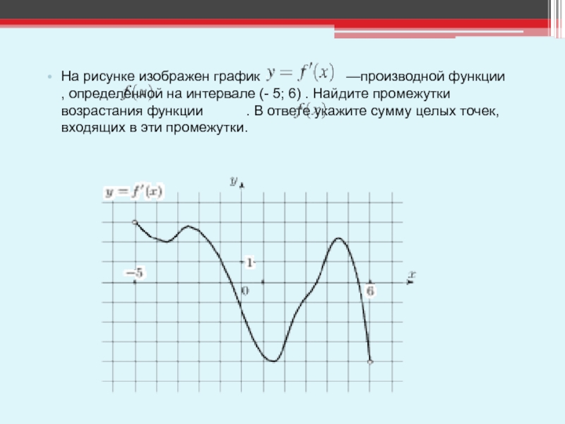 —производной функции , определенной на интервале (- 5; 6) . Найдите промежутки возрастания функции . В ответе укажите сумму целых точек, входящих в эти промежутки.