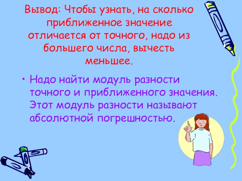 Слайд 14Вывод: Чтобы узнать, на сколько приближенное значение отличается от точного, надо