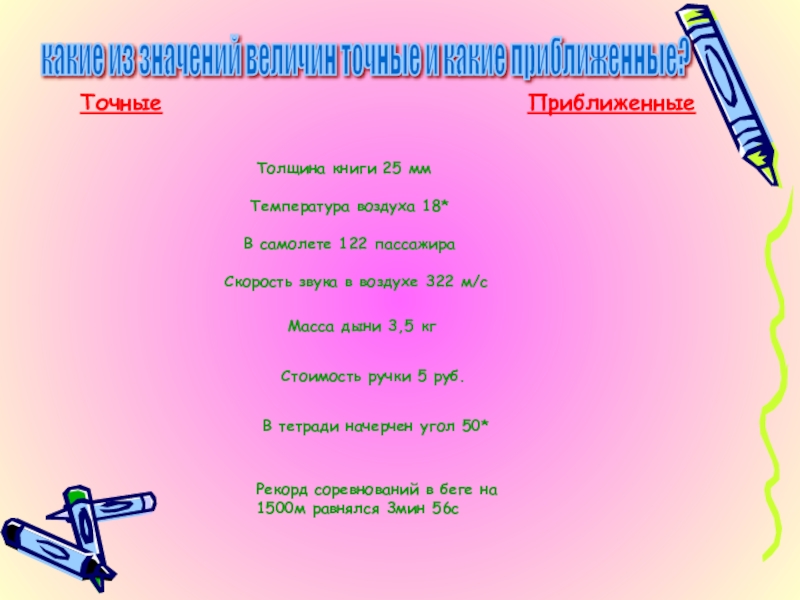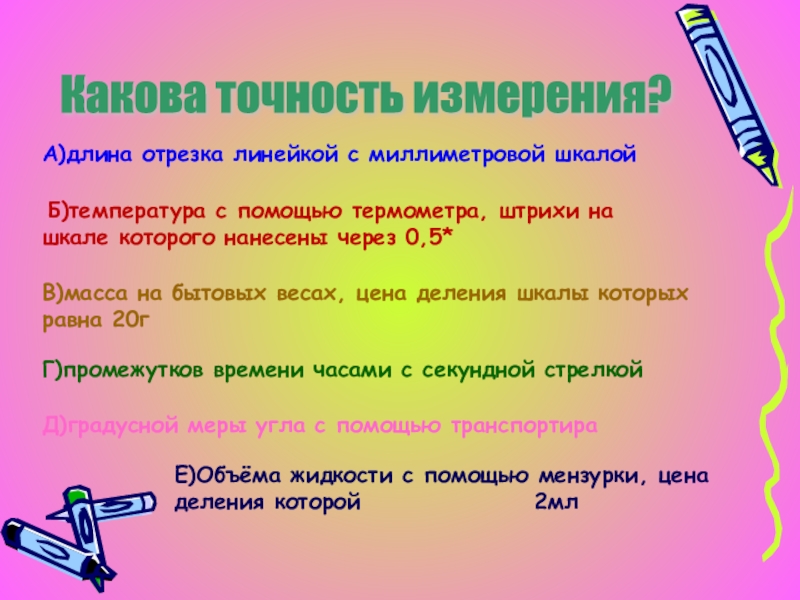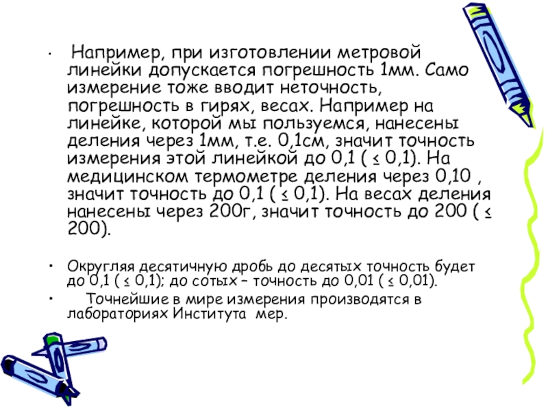 тоже вводит неточность, погрешность в гирях, весах. Например на линейке, которой мы пользуемся, нанесены деления через 1мм, т.е. 0,1см, значит точность измерения этой линейкой до 0,1 ( ≤ 0,1). На медицинском термометре деления через 0,10 , значит точность до 0,1 ( ≤ 0,1). На весах деления нанесены через 200г, значит точность до 200 ( ≤ 200).