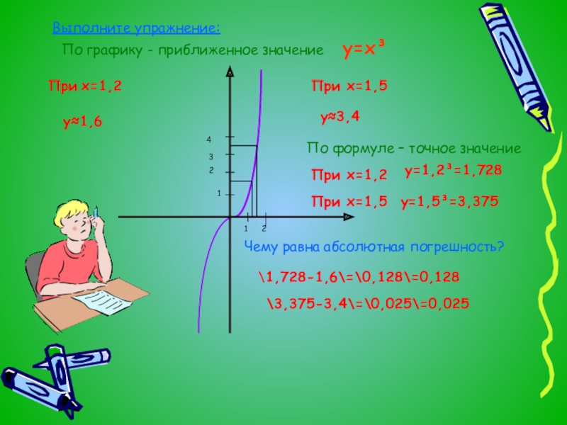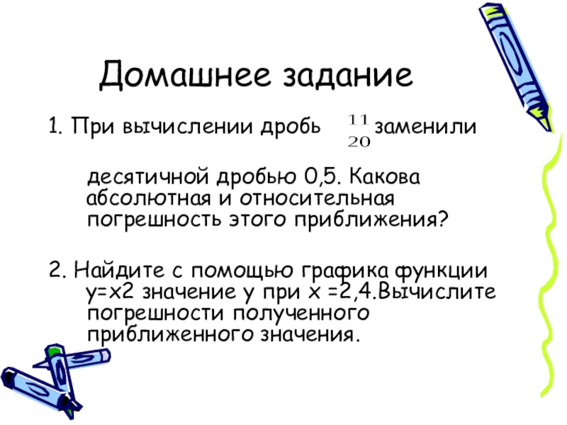 2. Найдите с помощью графика функции y=x2 значение y при x =2,4.Вычислите погрешности полученного приближенного значения.