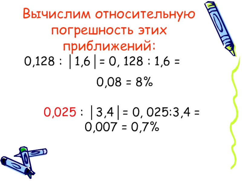Слайд 20Вычислим относительную погрешность этих приближений: