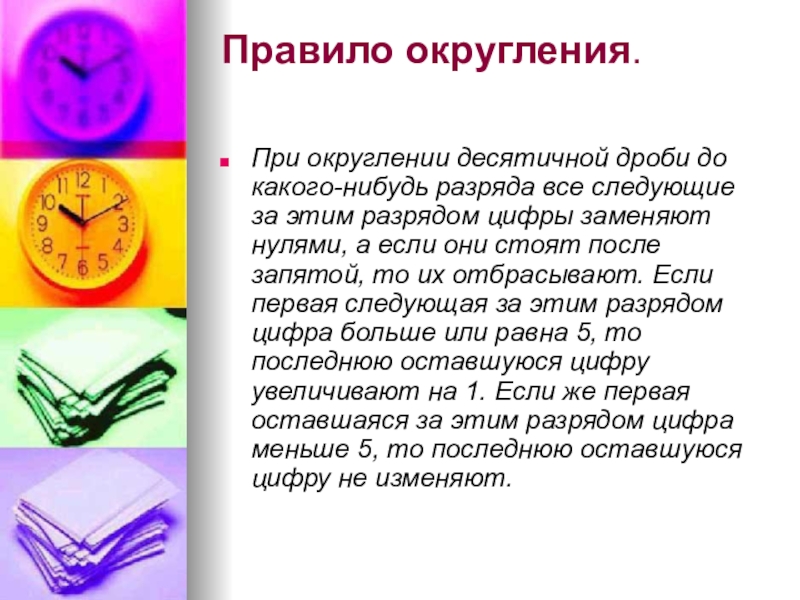 этим разрядом цифры заменяют нулями, а если они стоят после запятой, то их отбрасывают. Если первая следующая за этим разрядом цифра больше или равна 5, то последнюю оставшуюся цифру увеличивают на 1. Если же первая оставшаяся за этим разрядом цифра меньше 5, то последнюю оставшуюся цифру не изменяют.