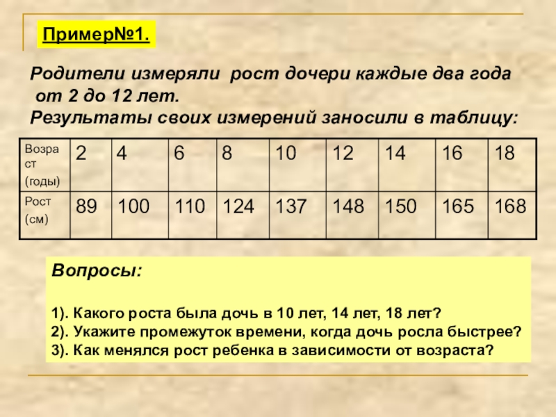 1). Какого роста была дочь в 10 лет, 14 лет, 18 лет?