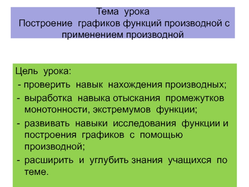 развивать навыки исследования функции и построения графиков с помощью производной;