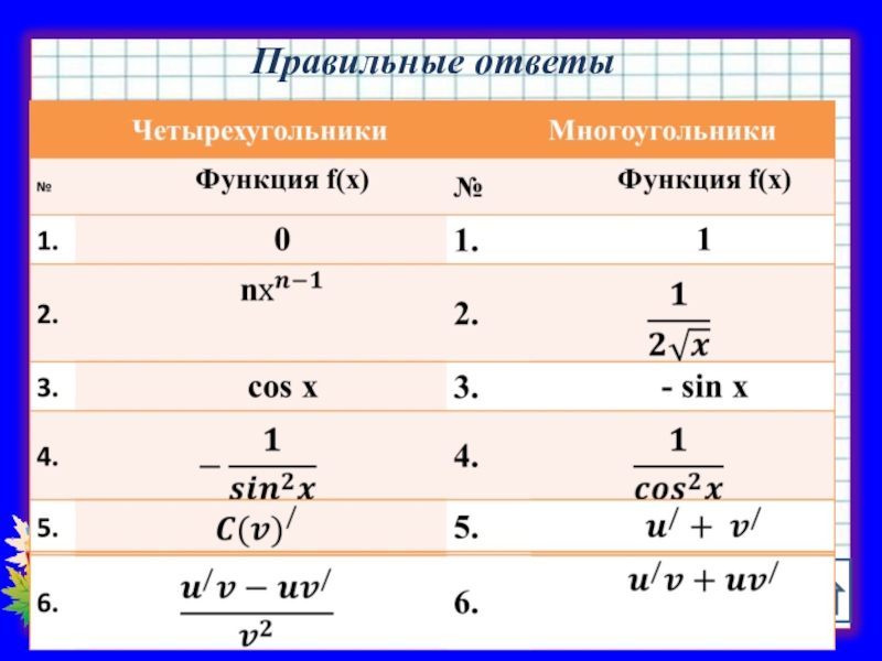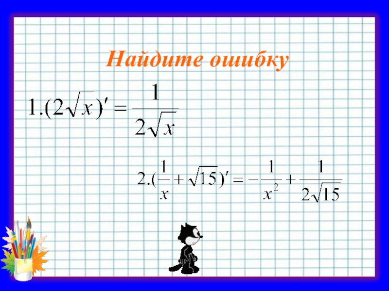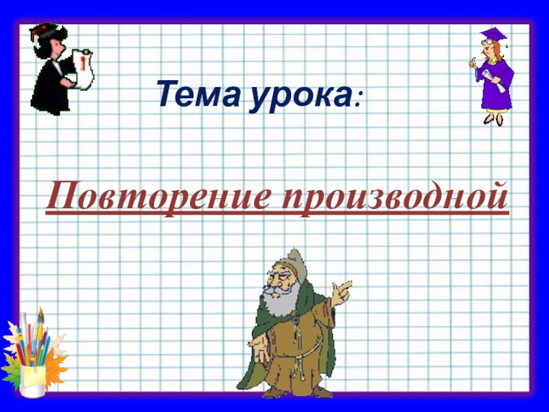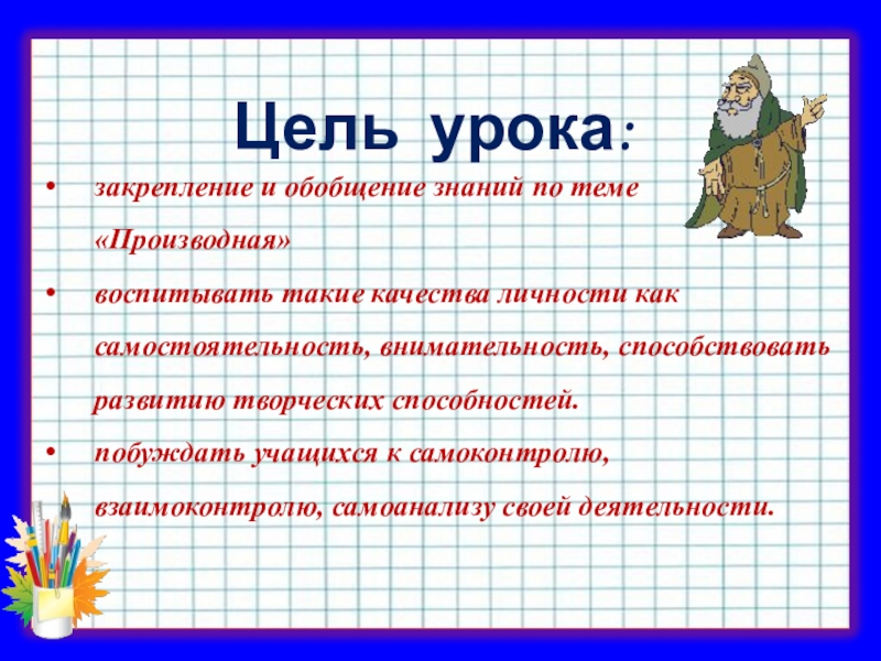 Цель урока:закрепление и обобщение знаний по теме «Производная»воспитывать такие качества личности как самостоятельность, внимательность, способствовать развитию творческих