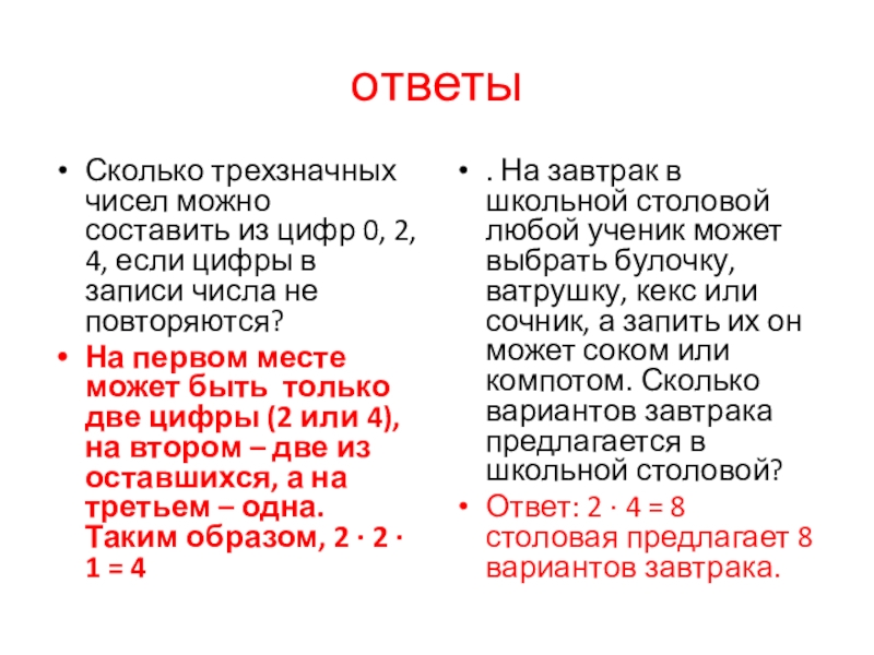 Ответ: 2 ∙ 4 = 8 столовая предлагает 8 вариантов завтрака.