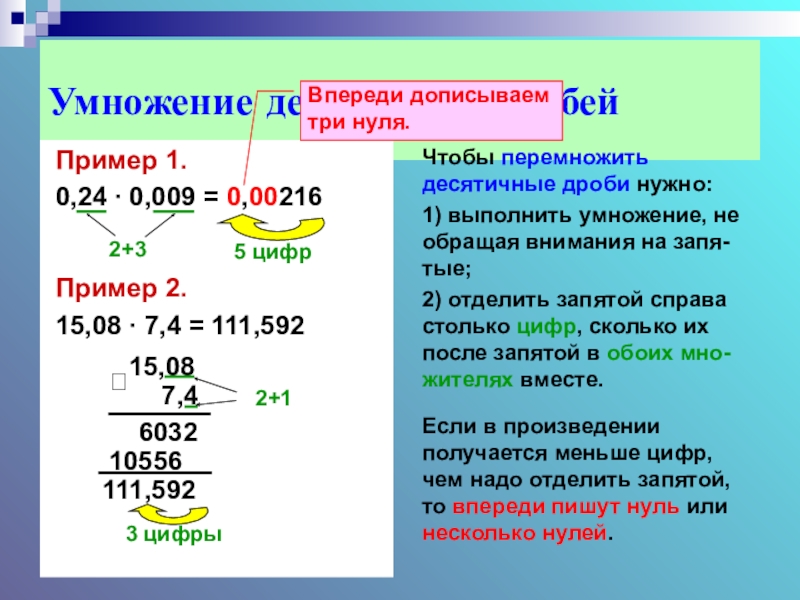 2) отделить запятой справа столько цифр, сколько их после запятой в обоих мно-жителях вместе.