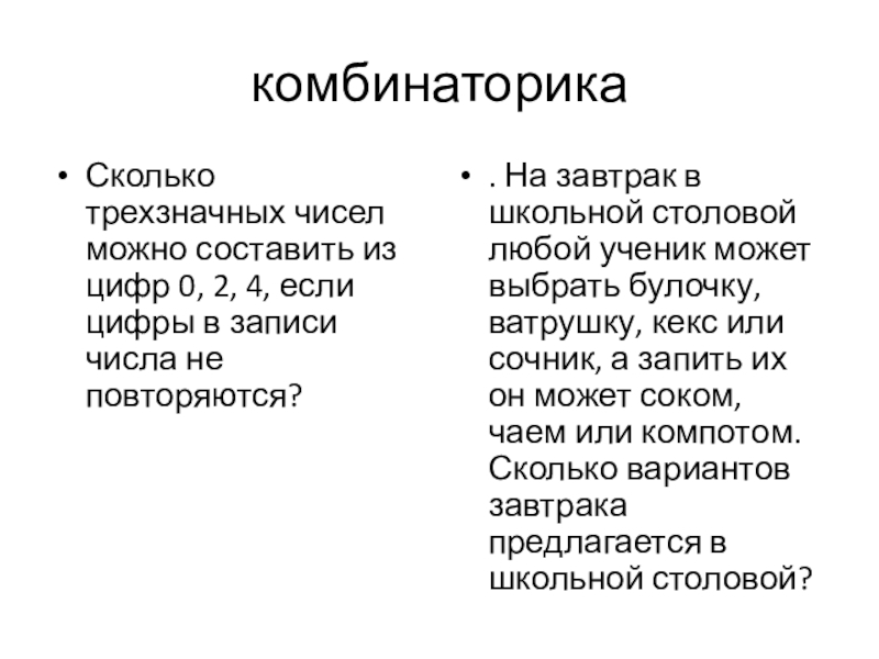. На завтрак в школьной столовой любой ученик может выбрать булочку, ватрушку, кекс или сочник, а запить их он может соком или компотом. Сколько вариантов завтрака предлагается в школьной столовой?