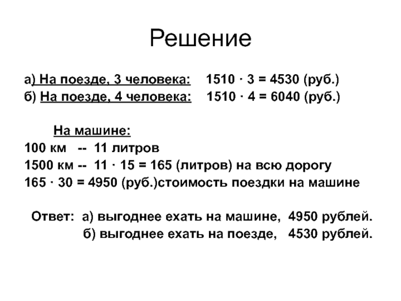 б) На поезде, 4 человека: 1510 · 4 = 6040 (руб.)
