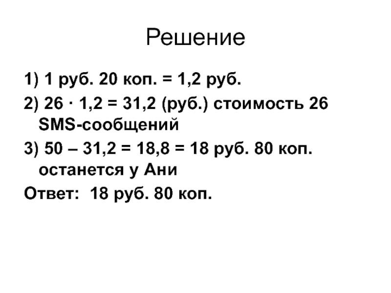 3) 50 – 31,2 = 18,8 = 18 руб. 80 коп. останется у Ани