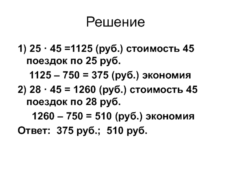 2) 28 · 45 = 1260 (руб.) стоимость 45 поездок по 28 руб.
