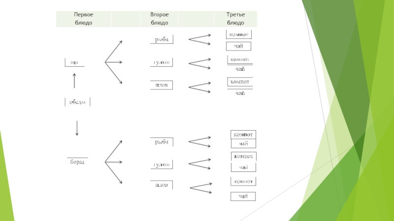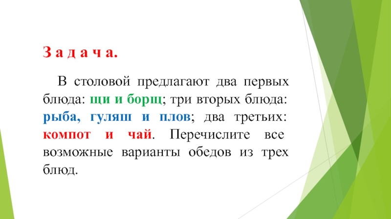 З а д а ч а. 	В столовой предлагают два первых блюда: щи и борщ; три вторых