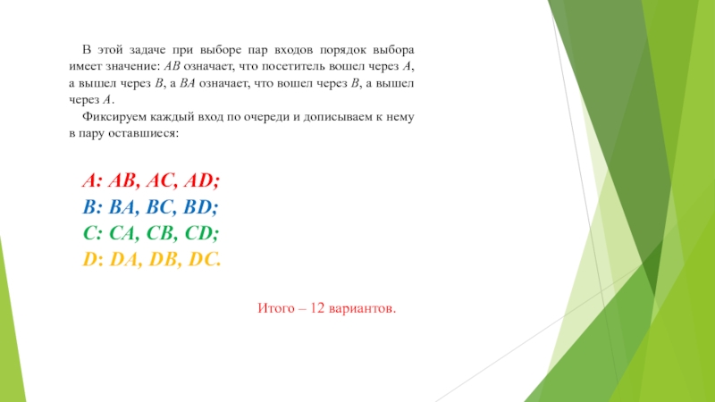 В этой задаче при выборе пар входов порядок выбора имеет значение: АВ означает, что посетитель вошел через