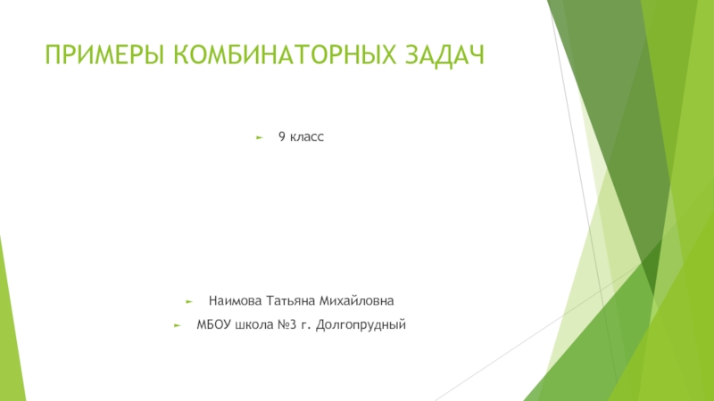 ПРИМЕРЫ КОМБИНАТОРНЫХ ЗАДАЧ9 классНаимова Татьяна МихайловнаМБОУ школа №3 г. Долгопрудный