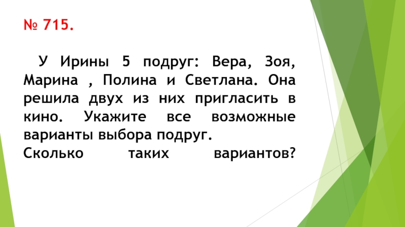 № 715. 	У Ирины 5 подруг: Вера, Зоя, Марина , Полина и Светлана. Она решила двух из