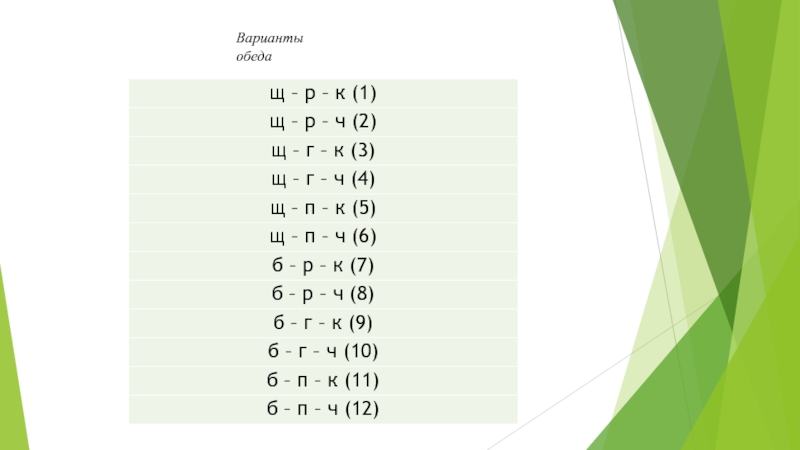 блюда: щи и борщ; три вторых блюда: рыба, гуляш и плов; два третьих: компот и чай. Перечислите все возможные варианты обедов из трех блюд.