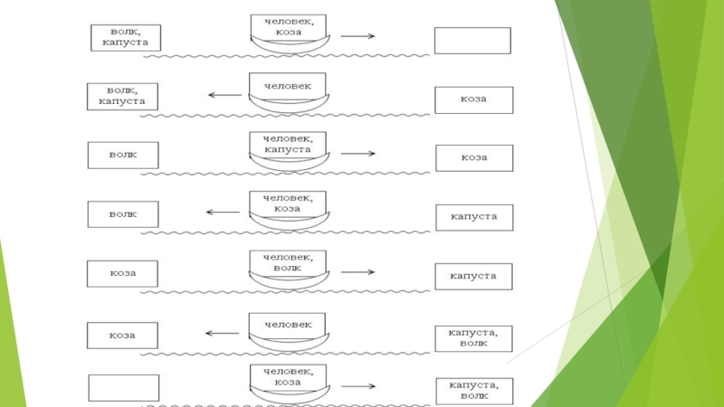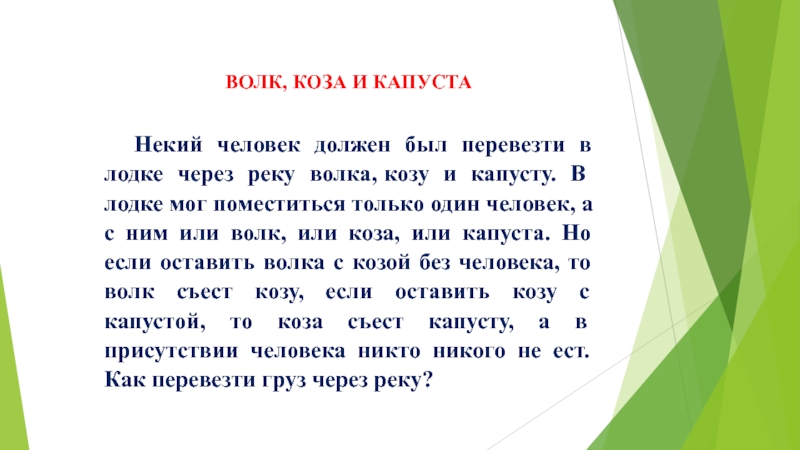реку волка, козу и капусту. В лодке мог поместиться только один человек, а с ним или волк, или коза, или капуста. Но если оставить волка с козой без человека, то волк съест козу, если оставить козу с капустой, то коза съест капусту, а в присутствии человека никто никого не ест. Как перевезти груз через реку?