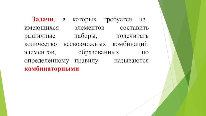 Слайд 6 Задачи, в которых требуется из имеющихся элементов составить различные наборы, подсчитать