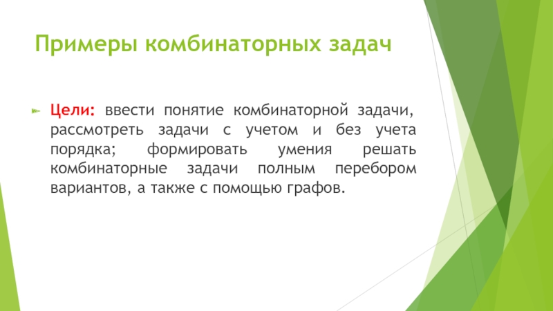Примеры комбинаторных задачЦели: ввести понятие комбинаторной задачи, рассмотреть задачи с учетом и без учета порядка; формировать умения решать комбинаторные задачи полным перебором вариантов, а также с помощью графов.