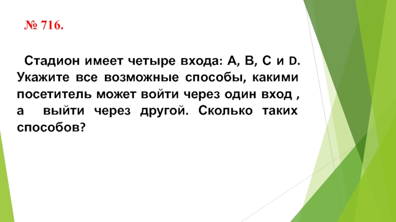 № 716. Стадион имеет четыре входа: А, В, С и D. Укажите все возможные способы, какими посетитель