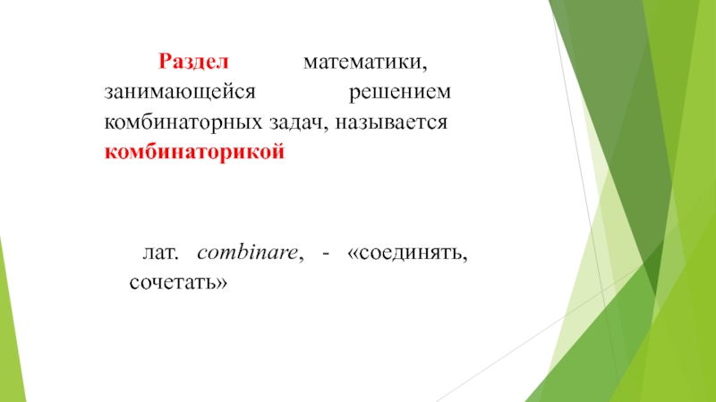 лат. combinare, - «соединять, сочетать»		Раздел математики, занимающейся решением комбинаторных задач, называется комбинаторикой