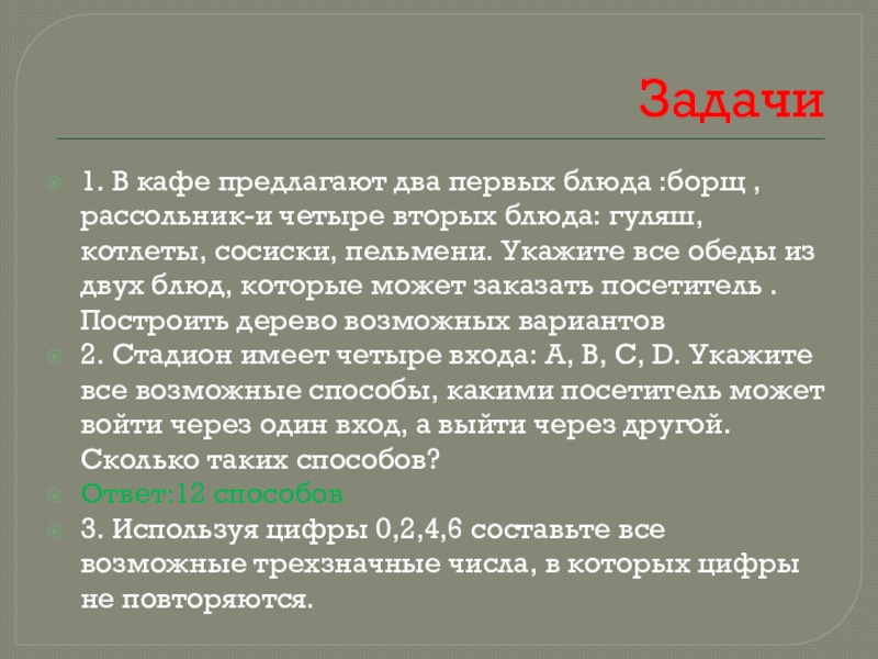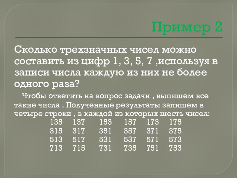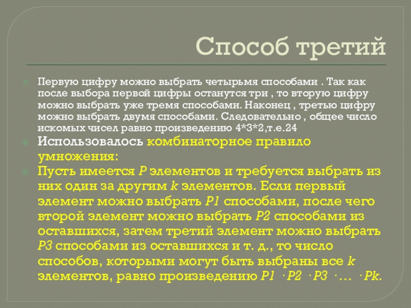 выбора первой цифры останутся три , то вторую цифру можно выбрать уже тремя способами. Наконец , третью цифру можно выбрать двумя способами. Следовательно , общее число искомых чисел равно произведению 4*3*2,т.е.24