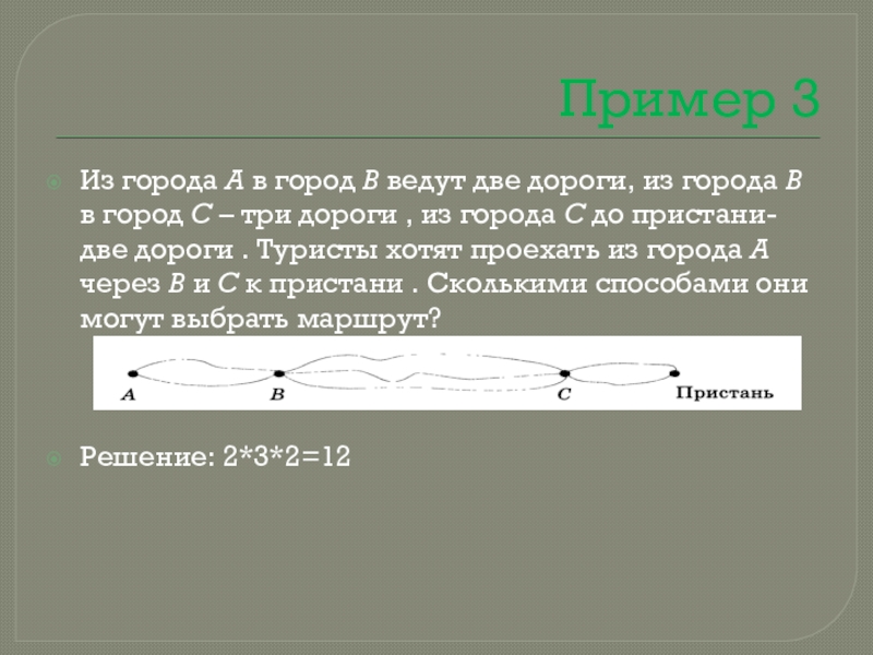города В в город С – три дороги , из города С до пристани-две дороги . Туристы хотят проехать из города А через В и С к пристани . Сколькими способами они могут выбрать маршрут?